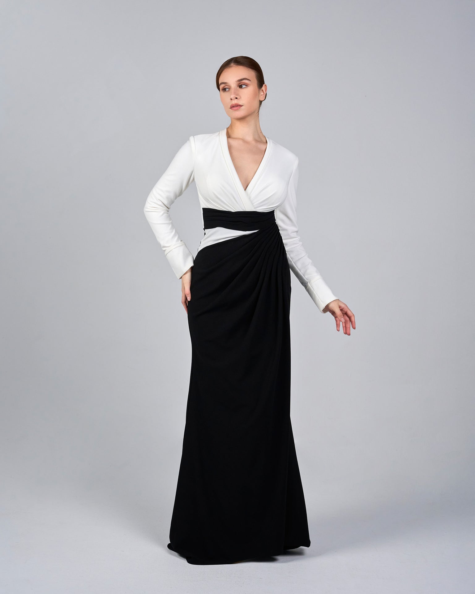 Refined monochrome gown featuring a white wrap-style bodice, long sleeves, and a black floor-length skirt with side ruching for a timeless, figure-flattering silhouette.