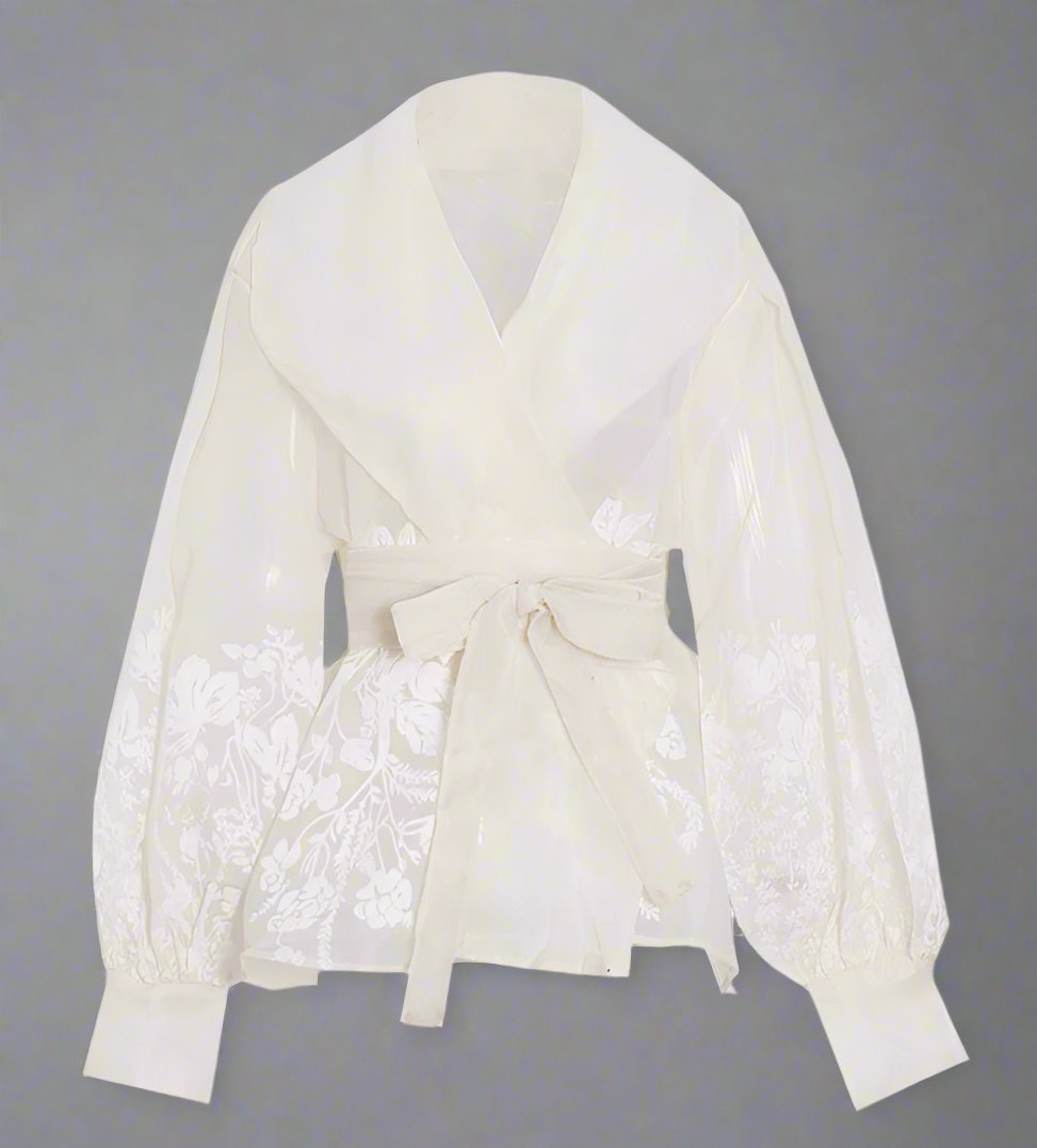 An exquisitely detailed white fabric adorned with a floral motif. The fabric's pattern intricate and well-executed, made of a high-quality material, The floral design, which is the main focus, The pattern and motif employed in the fabric's design give it a unique and distinctive look. The dominance of the color white provides a sense of purity and simplicity, which complements the complexity of the floral design.