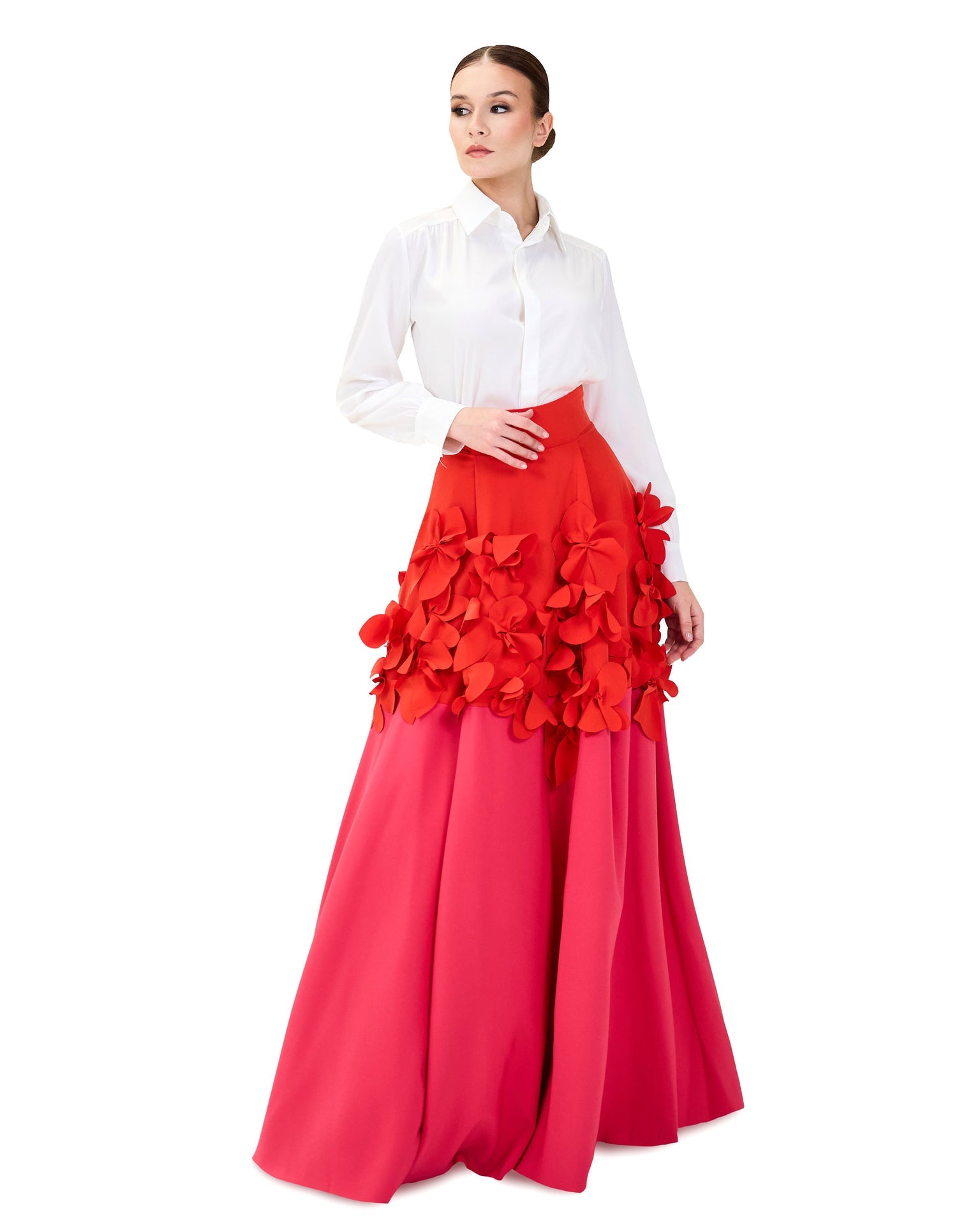 Vibrant high-waisted maxi skirt in bold orange and pink, adorned with cascading 3D floral appliqués for a playful yet elegant statement piece.