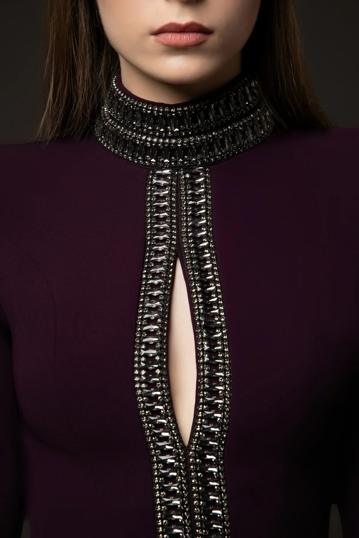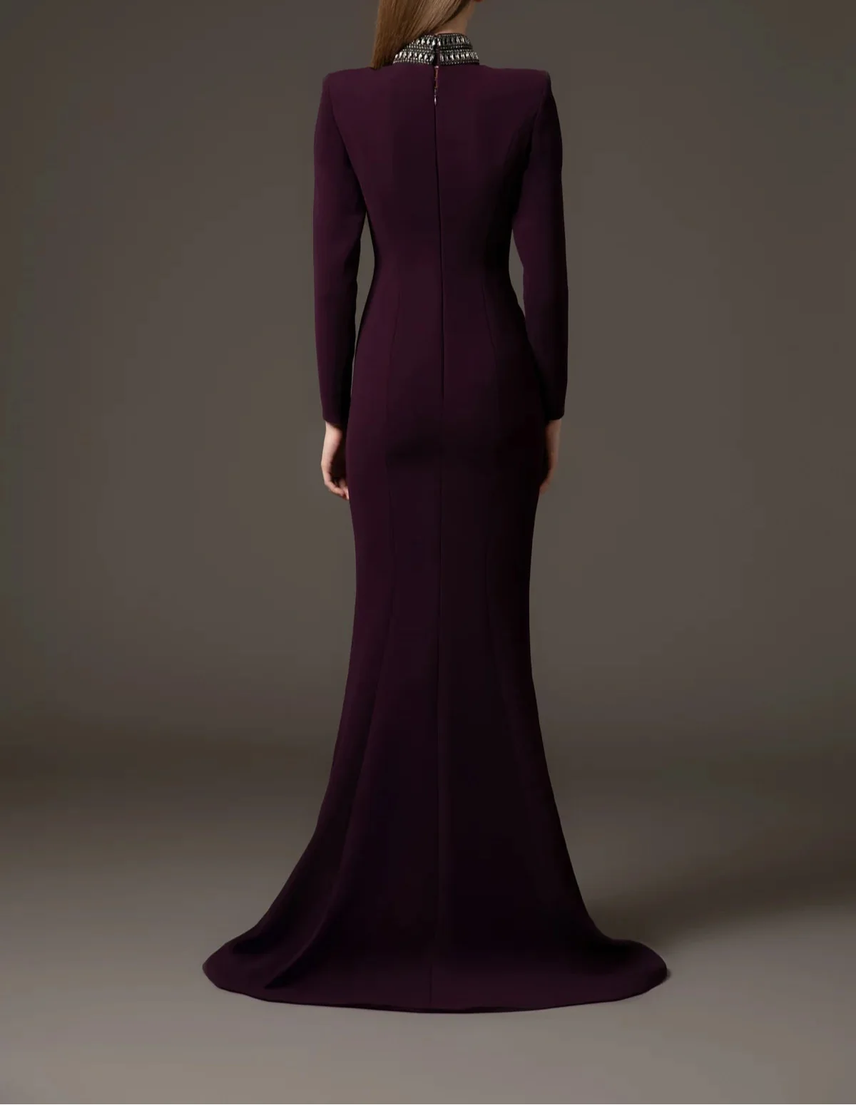 A majestic deep purple gown with full-length sleeves, structured shoulders, and a front slit outlined in glistening crystal embellishments. The high neckline adds a regal edge, making it a statement piece for formal evenings.