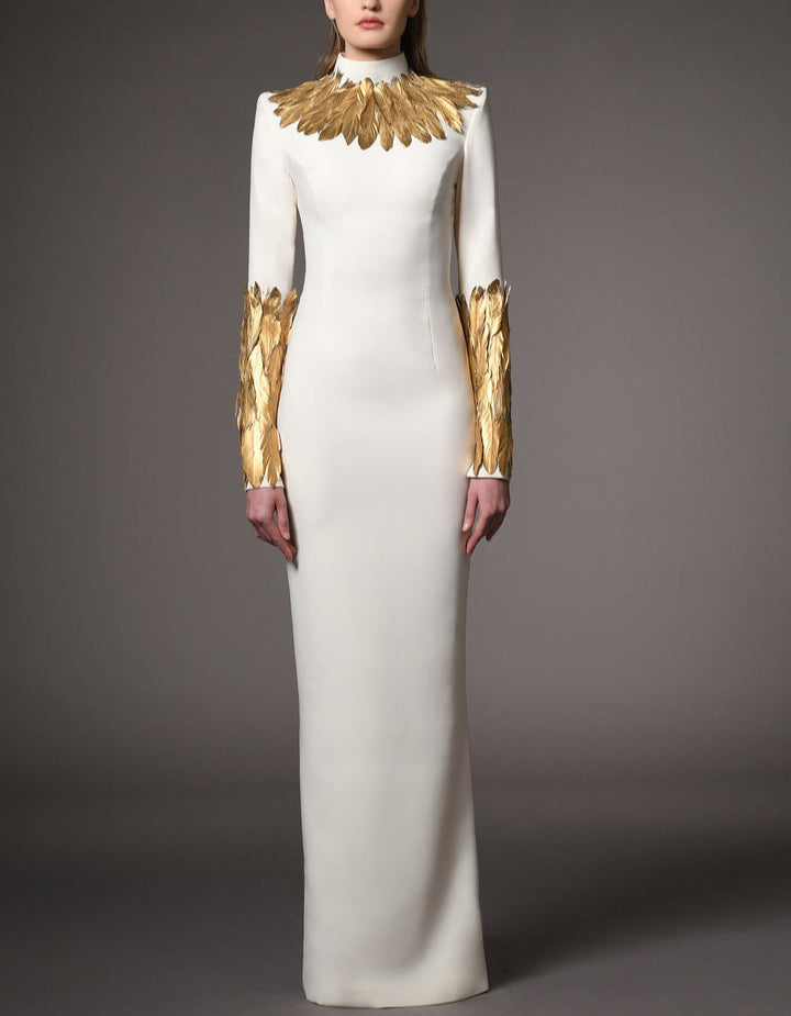 An ivory column gown featuring sculpted long sleeves and high neckline, adorned with dramatic gold feather appliqués at the collar and cuffs. Regal, commanding, and perfect for couture moments.