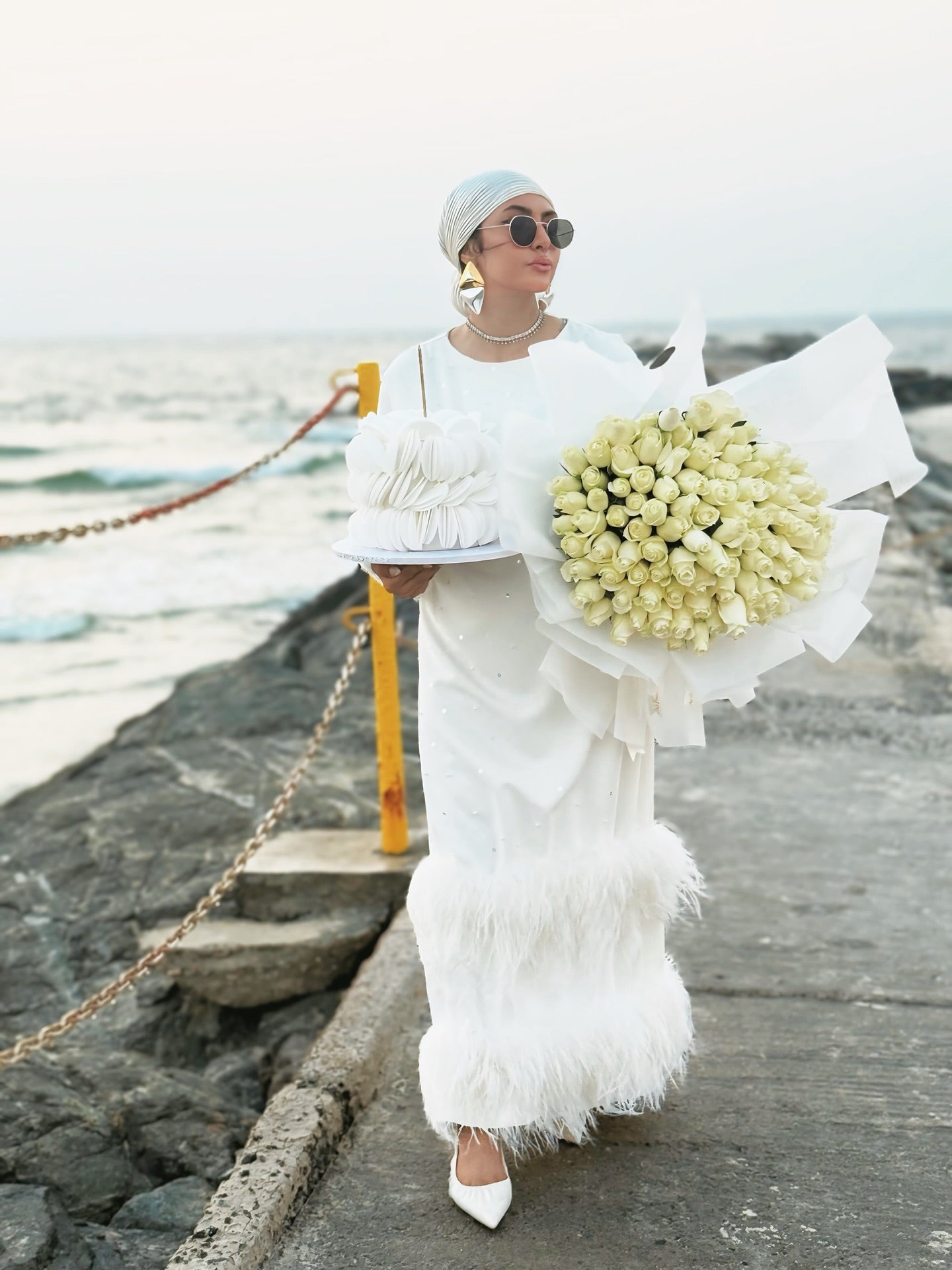 Luxurious ivory midi dress adorned with delicate crystal embellishments and lavish feather trims on the sleeves and hemline—an ethereal choice for refined soirées.