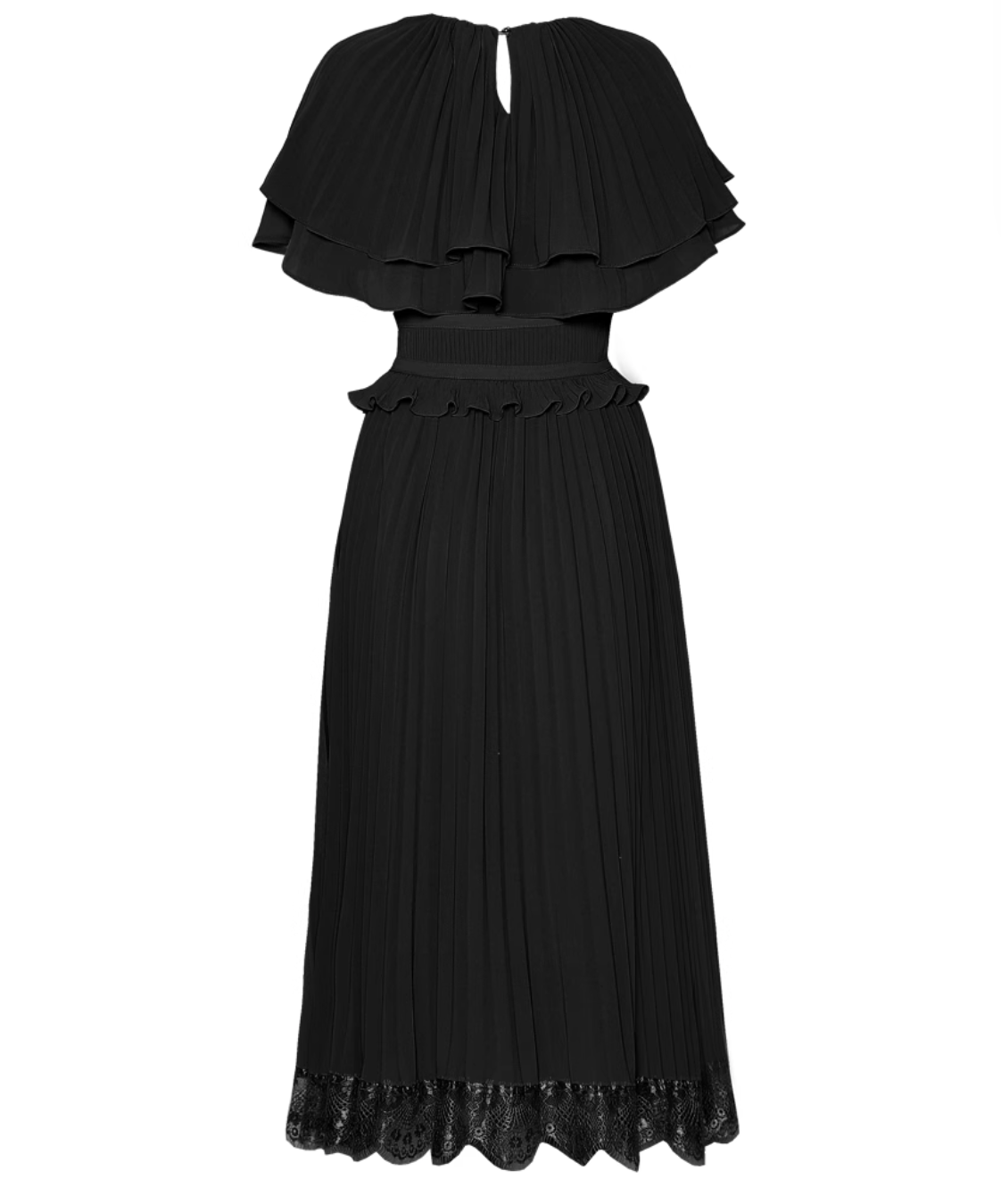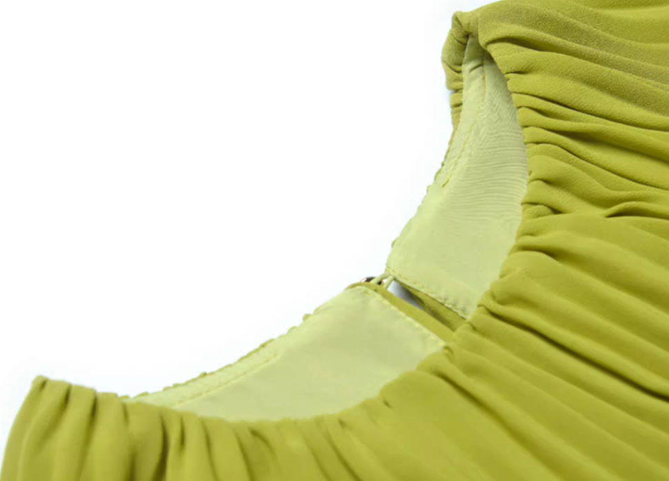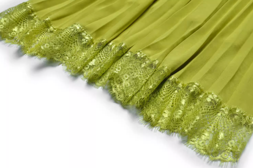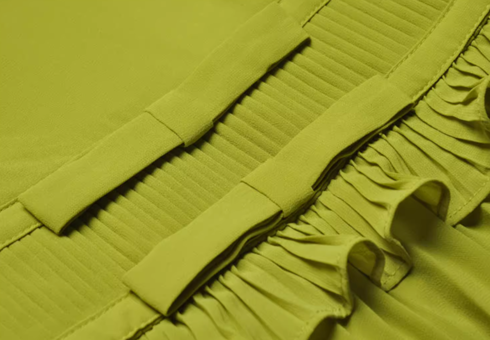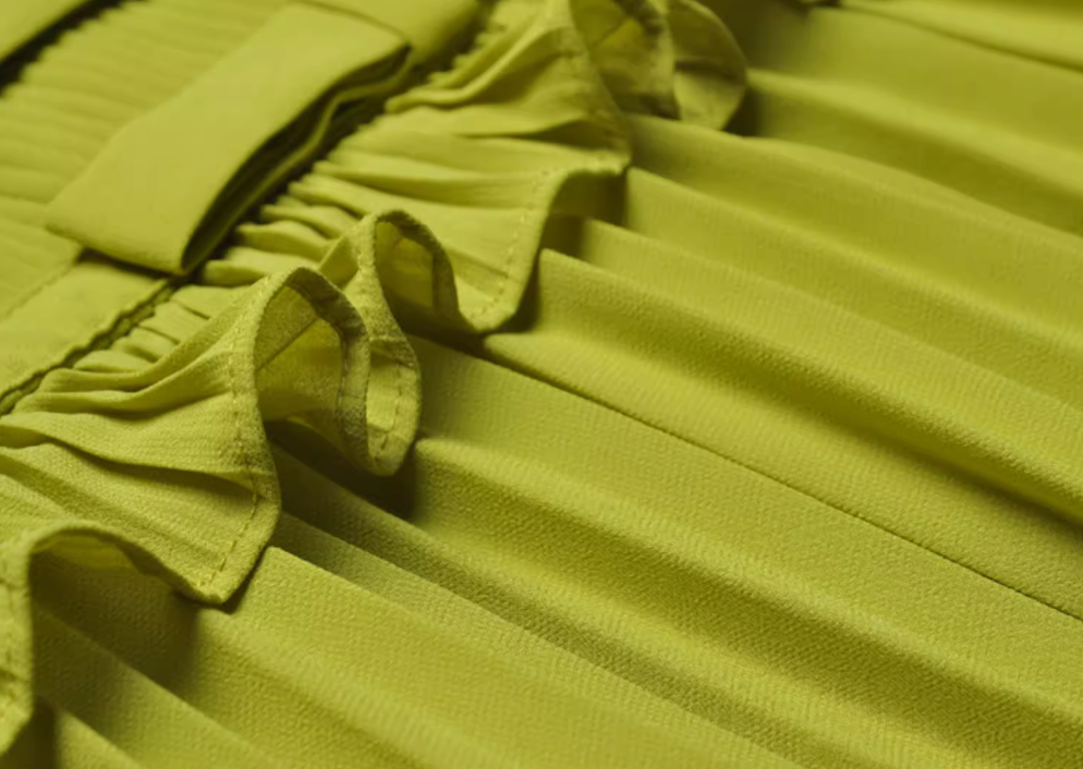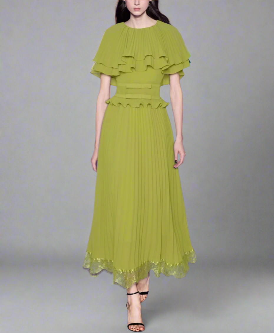 Charming lime-green midi dress featuring soft pleats, double-tiered ruffle sleeves, and a fitted waistband with delicate peplum detail—finished with embroidered lace along the hem for a playful yet refined finish.