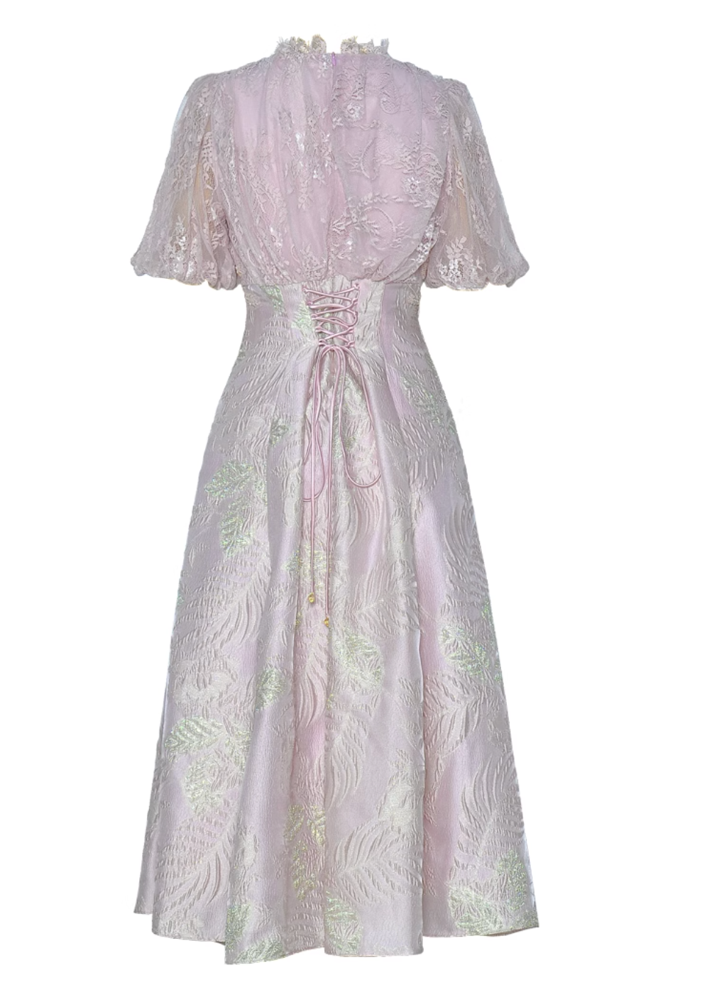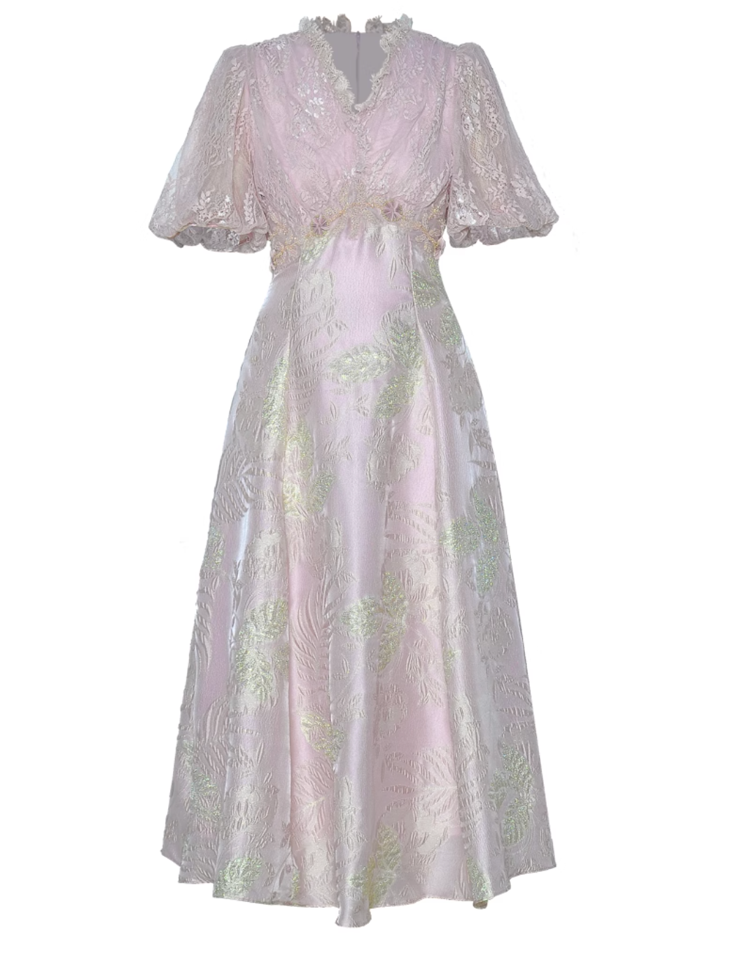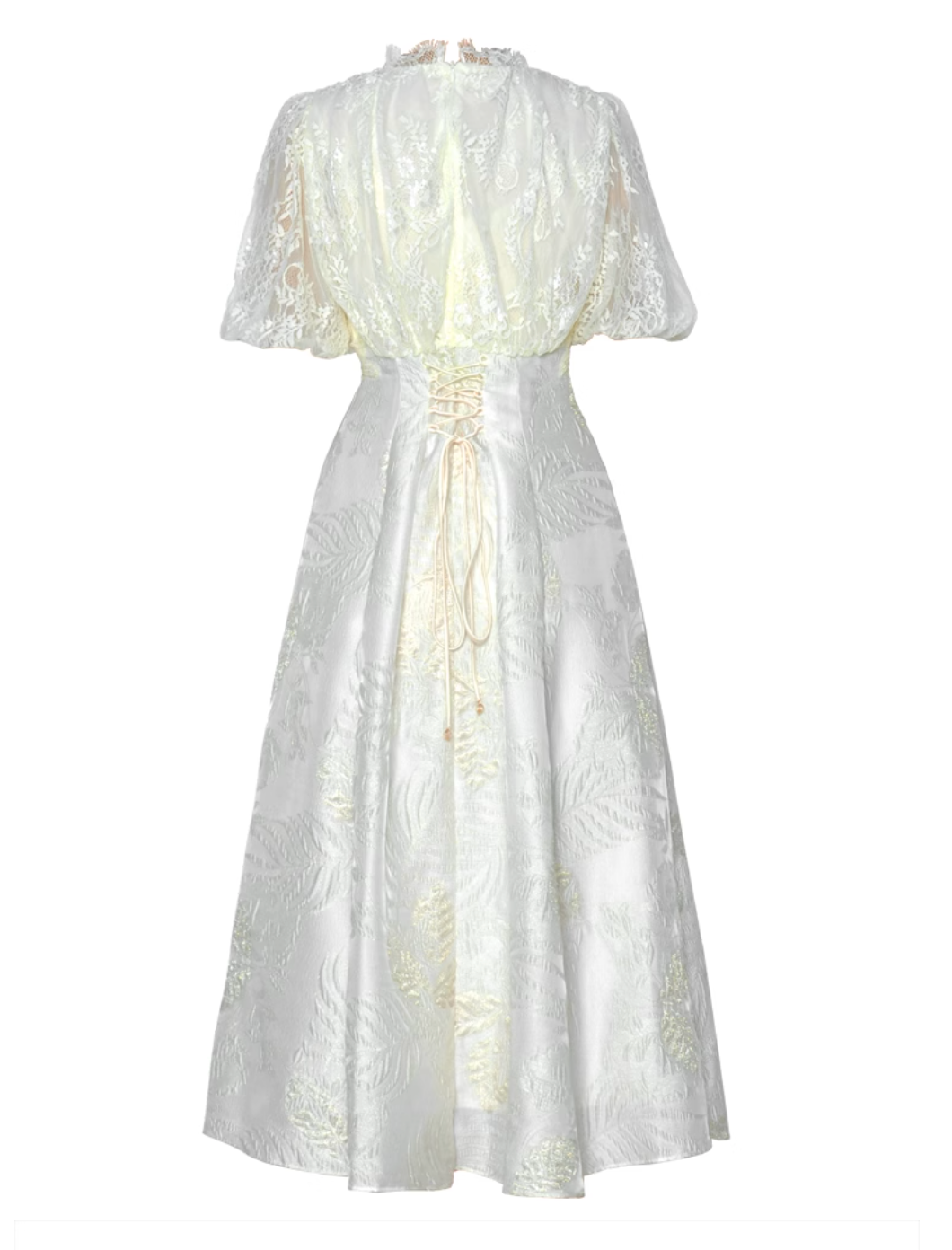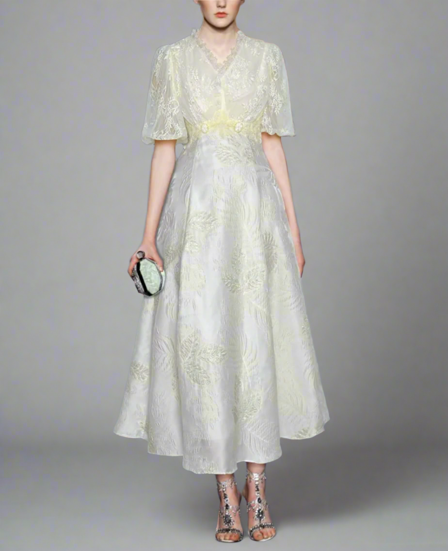 Romantic midi dress in soft ivory featuring a lace-trimmed V-neckline, sheer puff sleeves, and an embroidered floral pattern throughout. Accented with pearl-like buttons and a flared hem for a graceful finish.