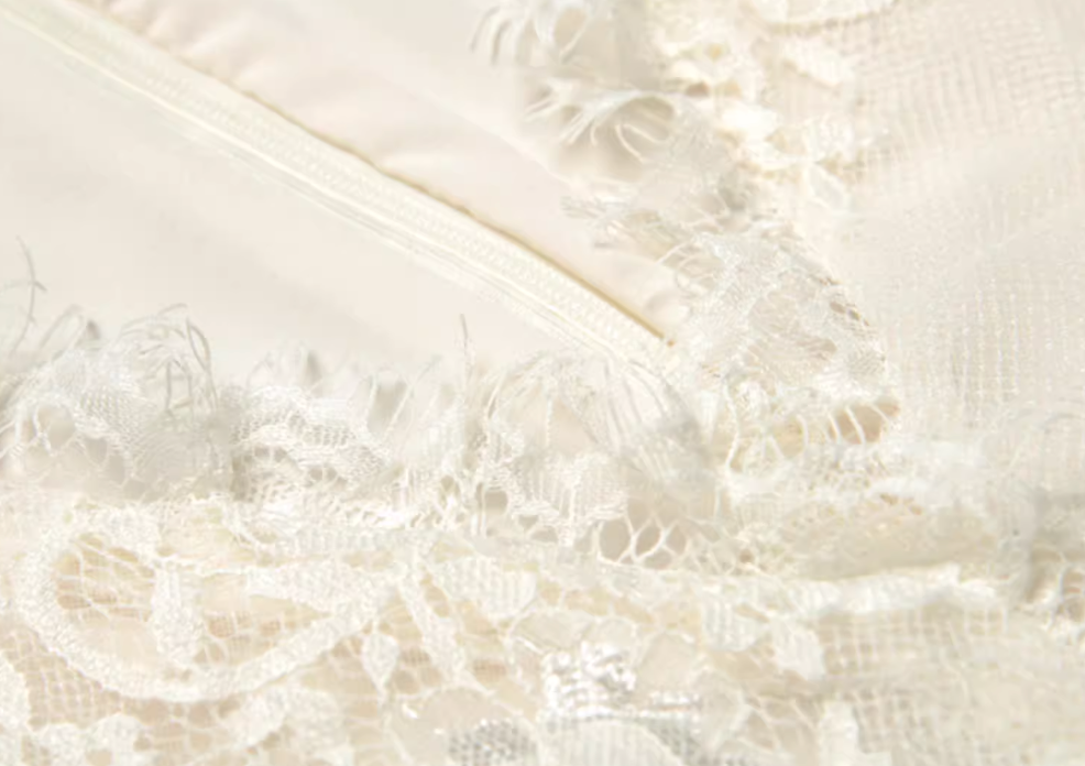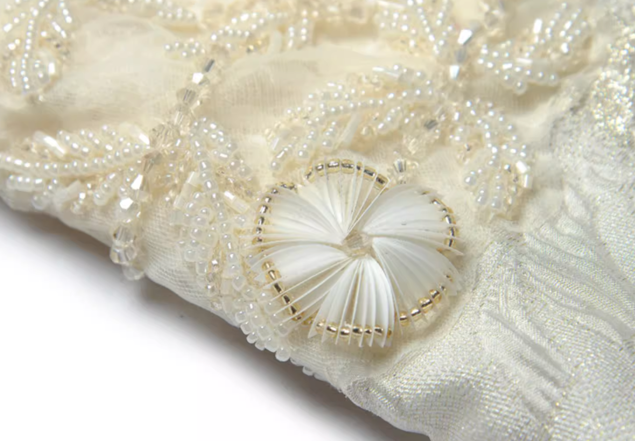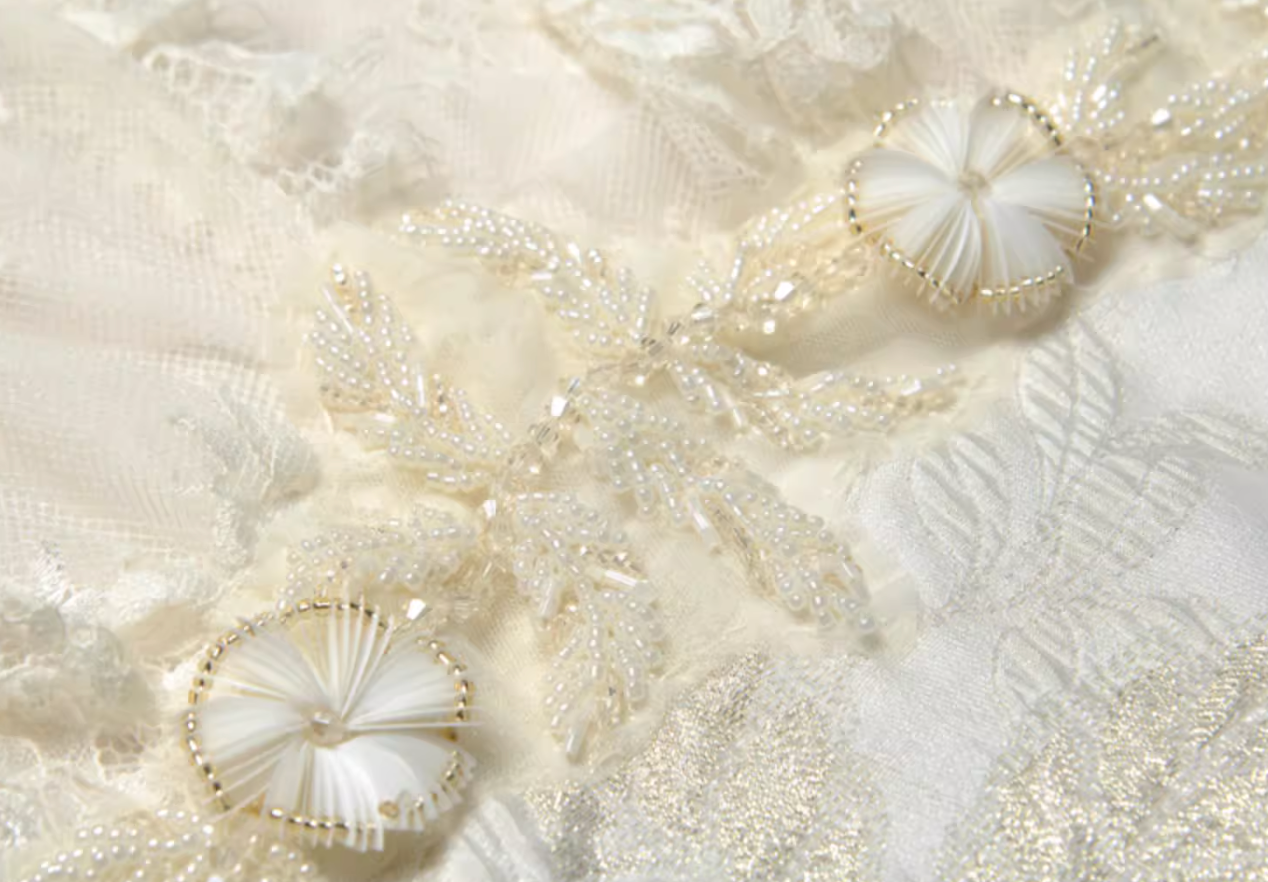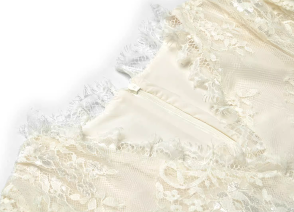 Romantic midi dress in soft ivory featuring a lace-trimmed V-neckline, sheer puff sleeves, and an embroidered floral pattern throughout. Accented with pearl-like buttons and a flared hem for a graceful finish.