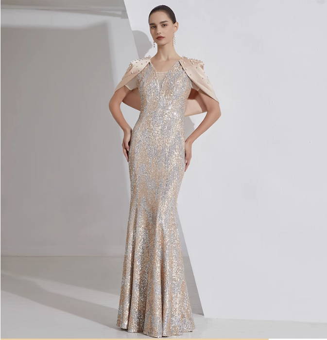 Champagne-toned mermaid gown fully encrusted with sequins, paired with a pearl-studded structured capelet. A glamorous silhouette designed to radiate elegance and modern sophistication at evening events.
