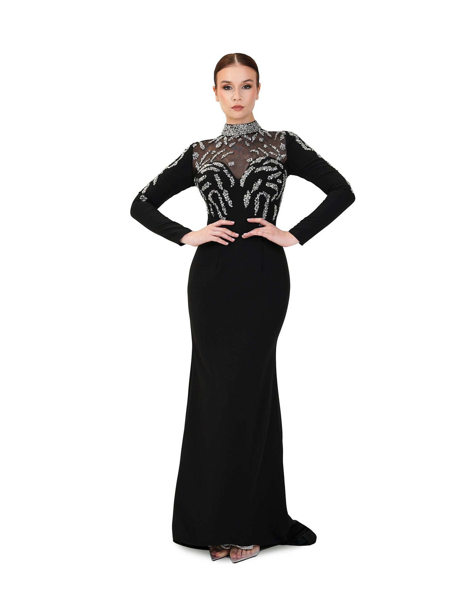 Sleek black gown with a fitted silhouette, high embellished neckline, and sheer bodice adorned with intricate crystal patterns—perfect for making a bold yet refined statement.