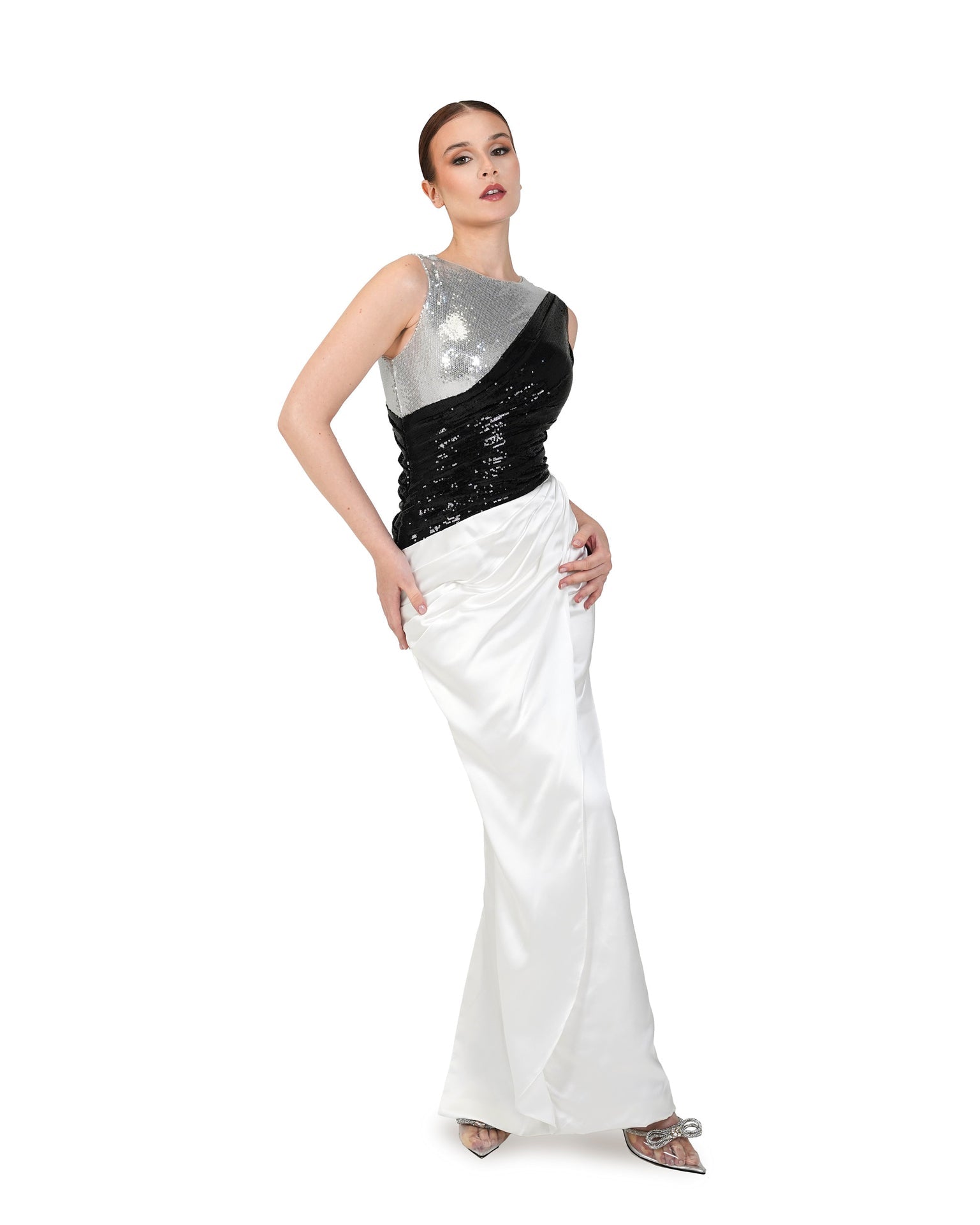 Contemporary sleeveless gown featuring a silver and black sequin-paneled bodice with an asymmetrical design, paired with a lustrous white satin floor-length skirt for a striking evening statement.