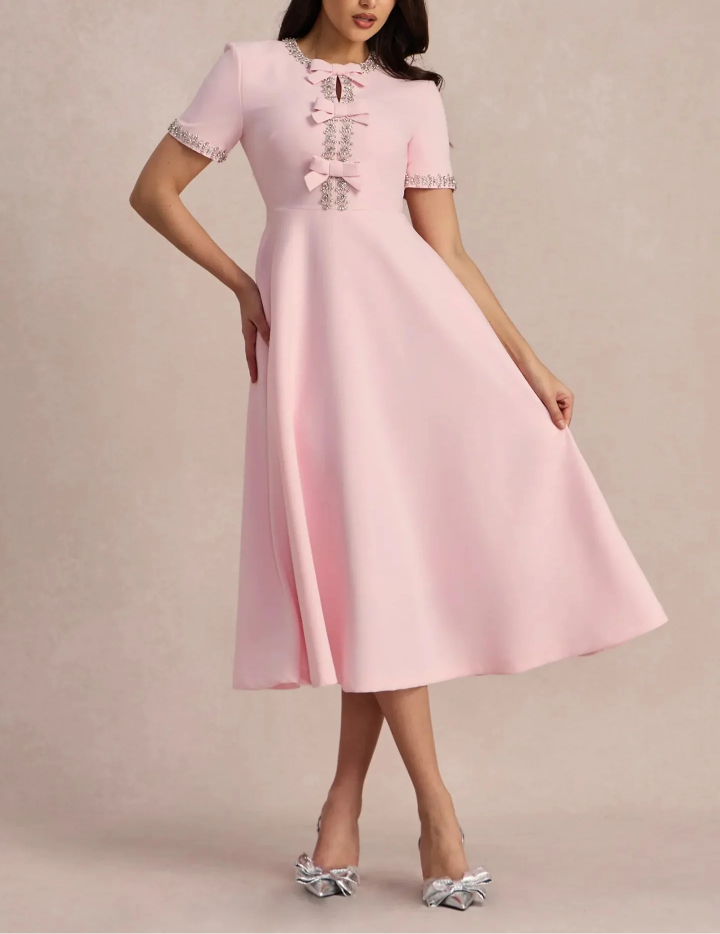 A charming fusion of elegance and femininity, this A-line dress features short sleeves and delicate embellishments along the collar and sleeve hems. The front is adorned with three dainty bows accented by intricate beading, adding a whimsical yet sophisticated touch. Crafted from a soft flowing fabric, the flared silhouette ensures graceful movement, perfect for daytime elegance or an evening affair. Available in pastel pink, classic black, ivory white, and serene sky blue