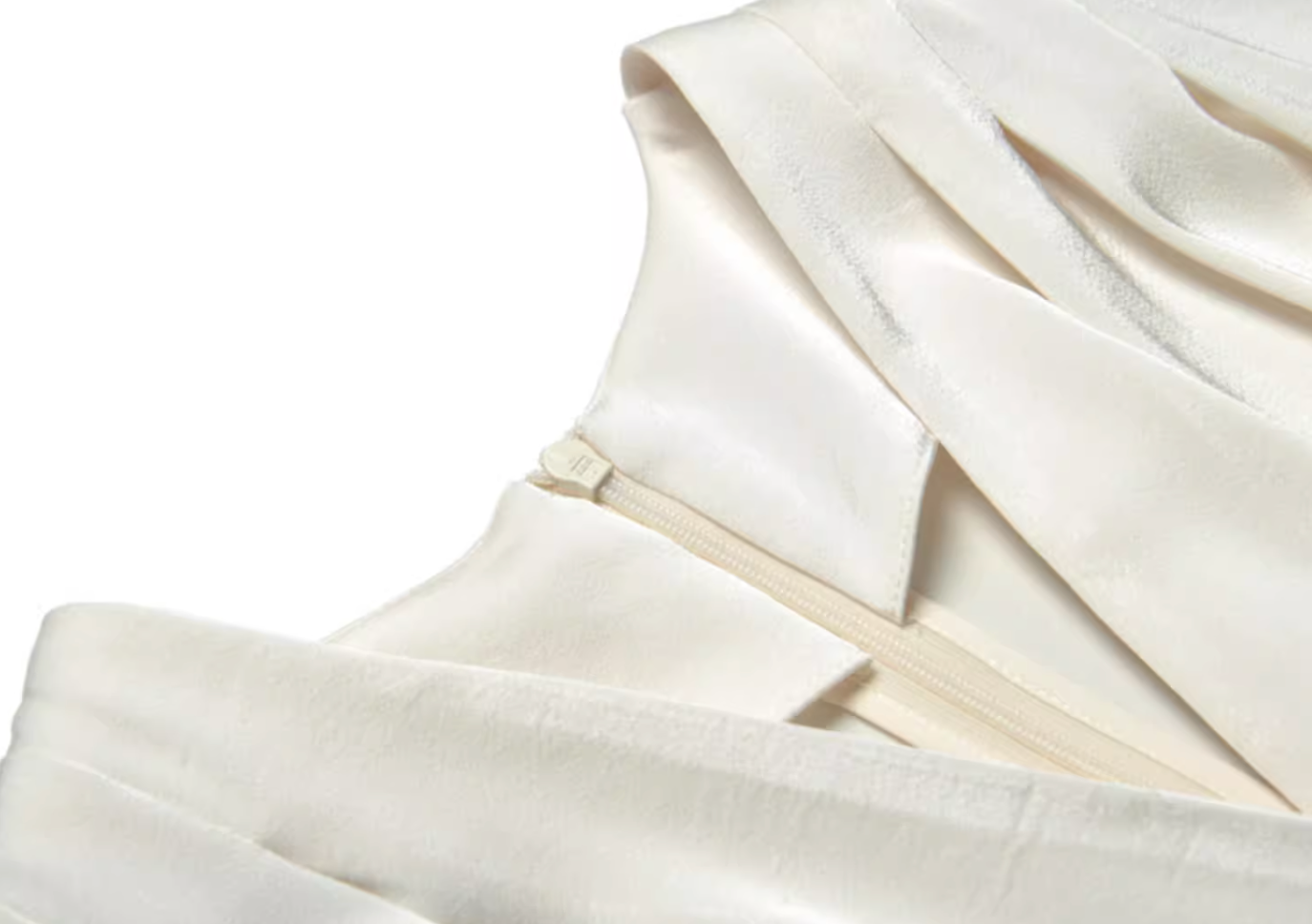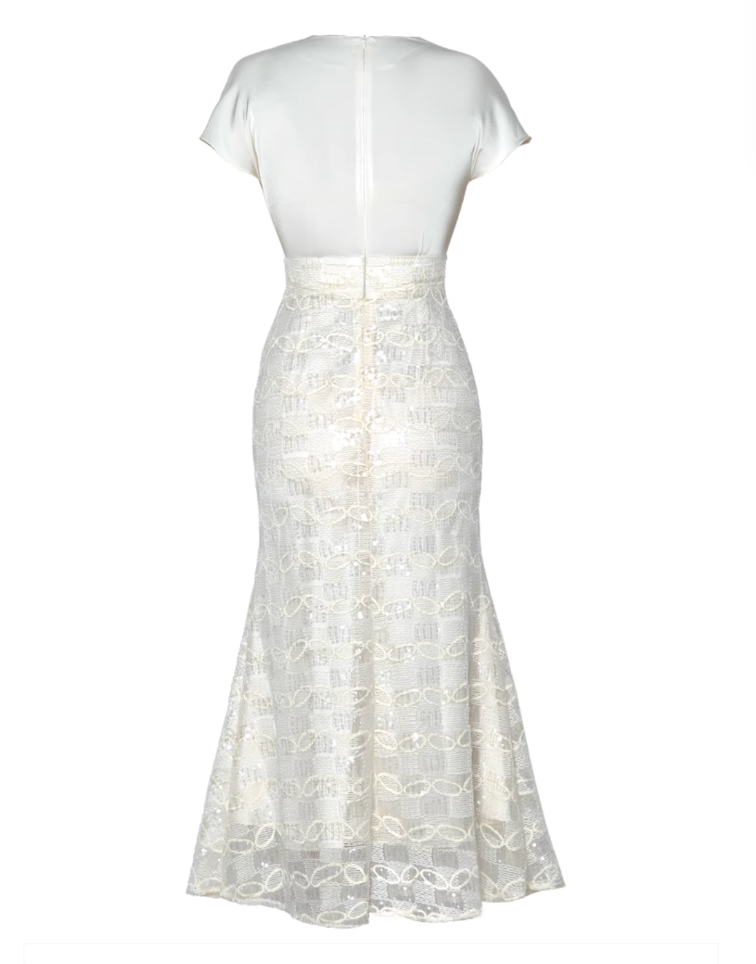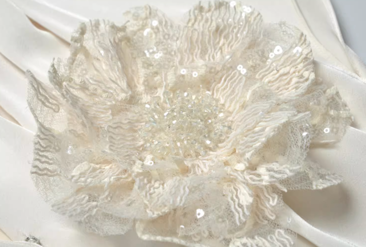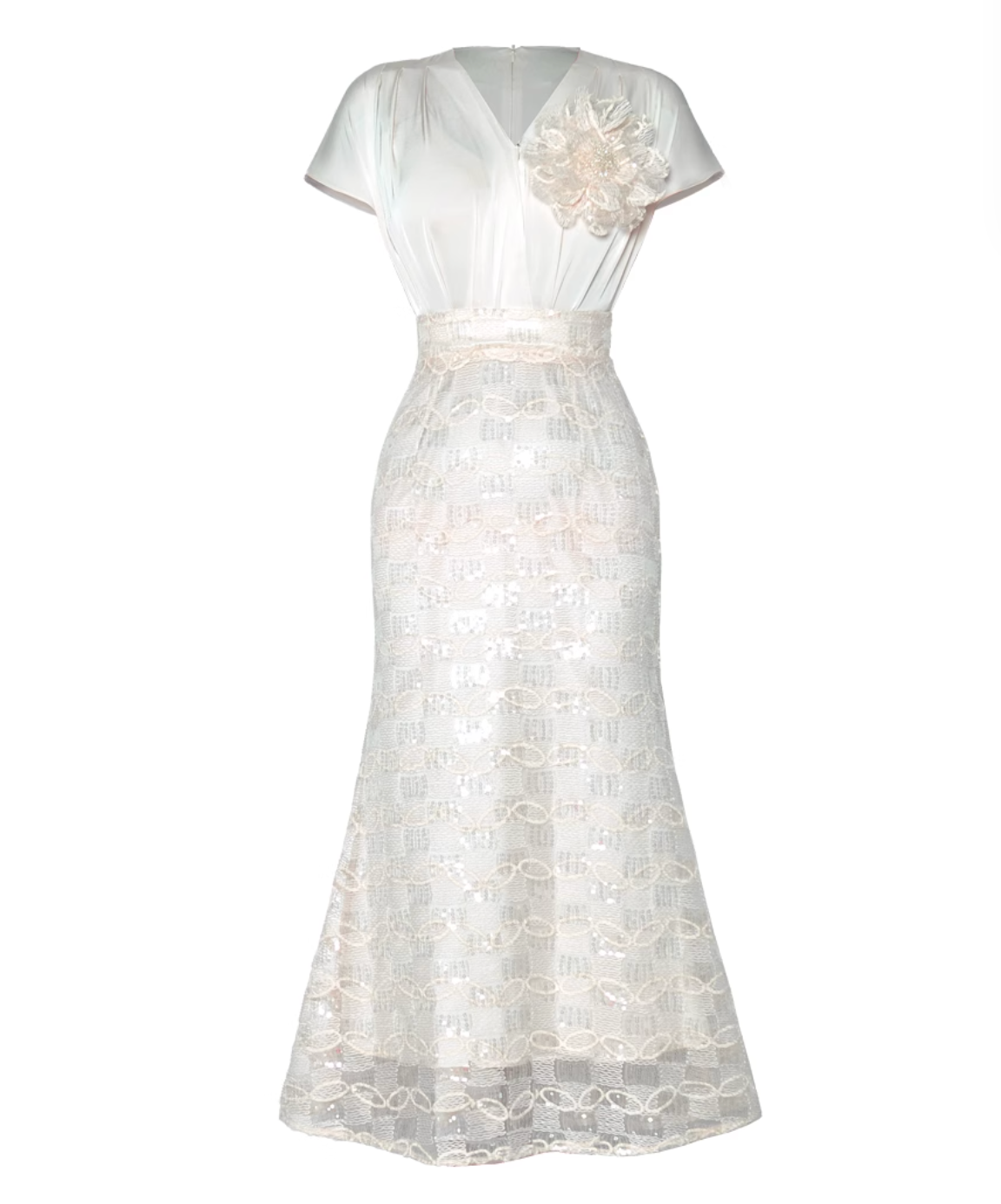 Elegant pastel midi dress featuring a soft satin bodice with draped short sleeves, detailed with a 3D floral applique, and a shimmering lace skirt—ideal for refined daytime occasions or evening charm.