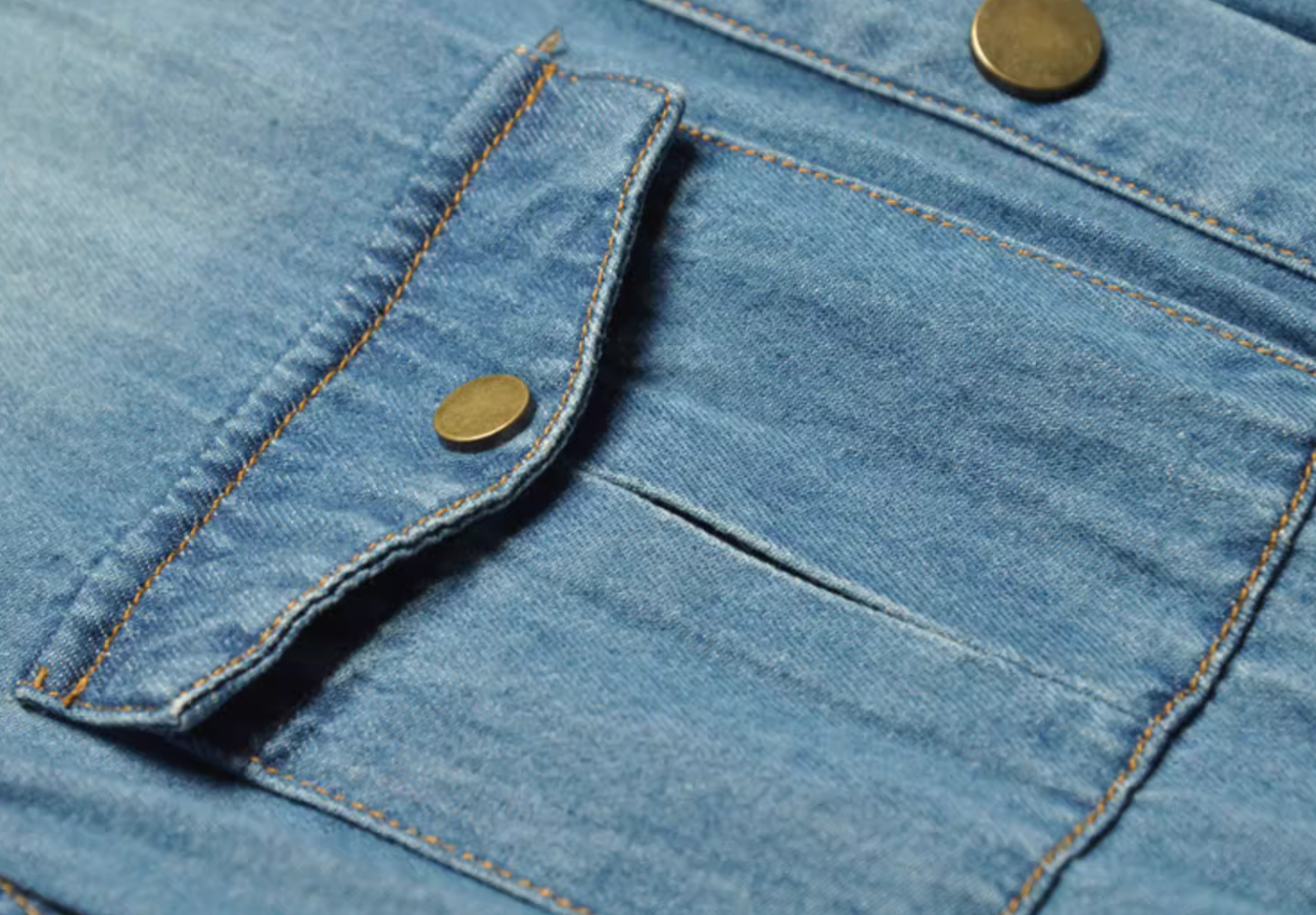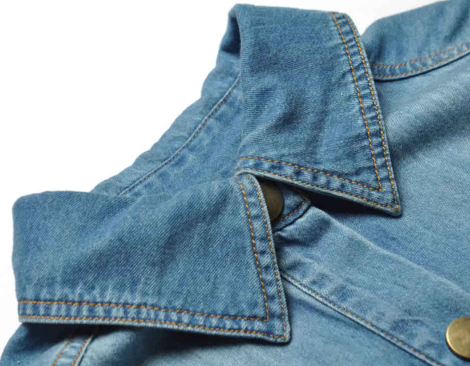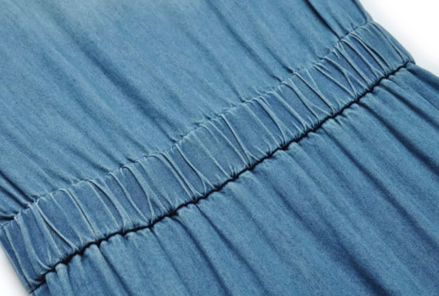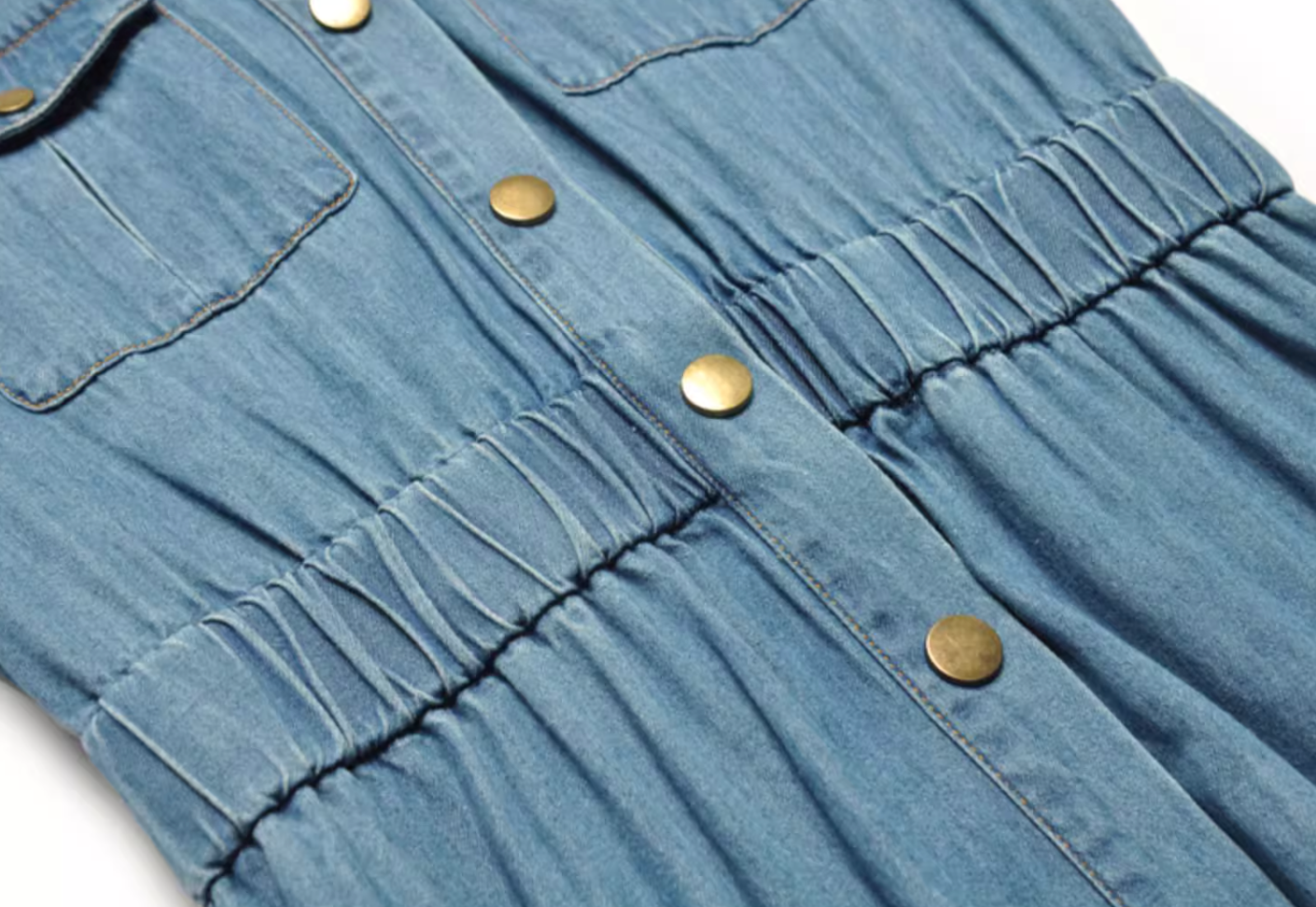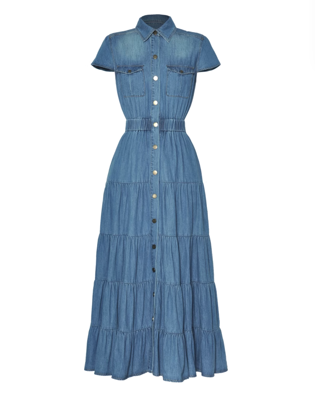 Casual yet refined, this light-wash denim dress features a collared neckline, short sleeves, chest pockets, and a tiered skirt with full-length button detailing—perfect for daytime outings and effortless style.