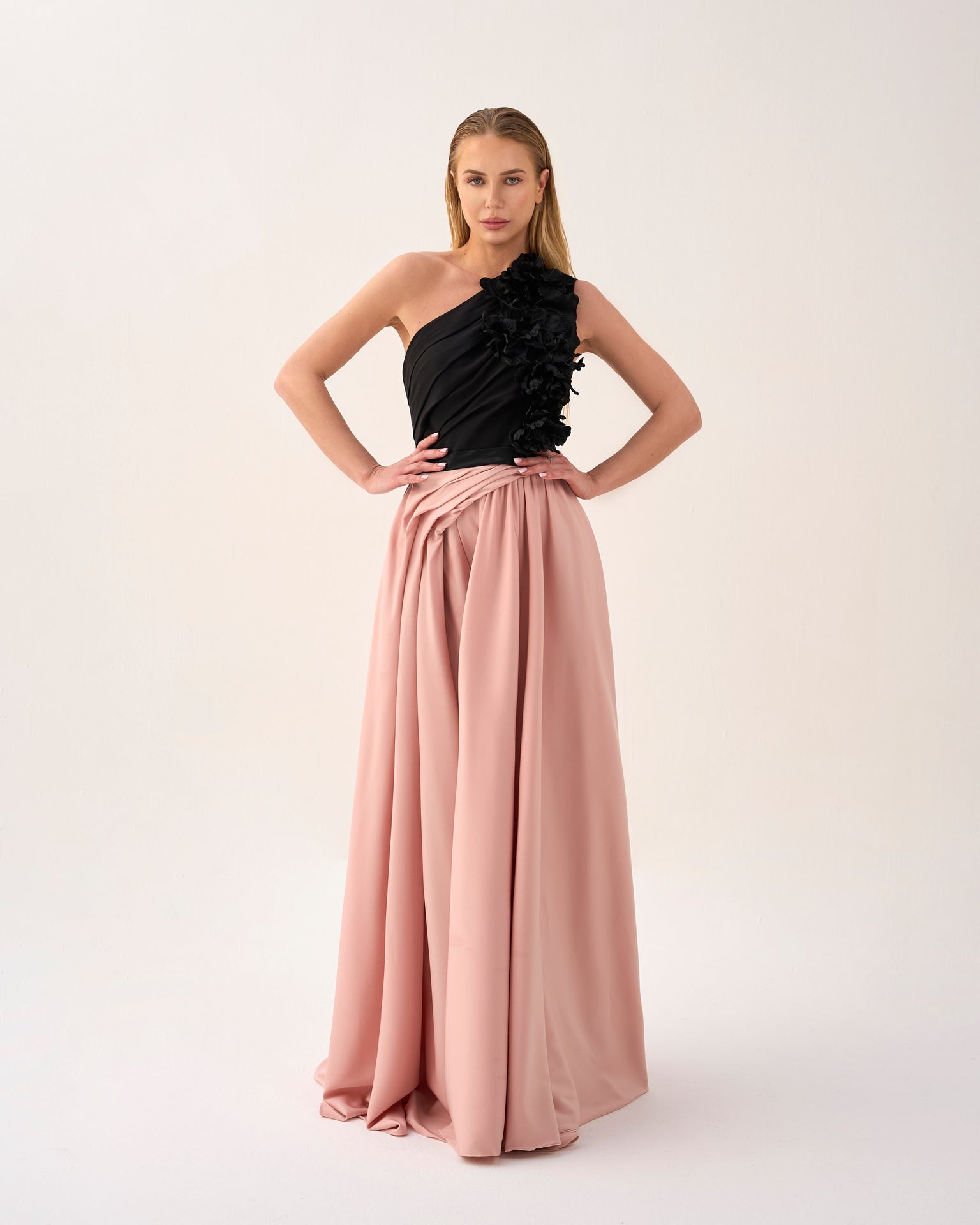 Elegant evening gown featuring a black one-shoulder bodice embellished with textured floral appliqués, paired with a flowing blush draped skirt for a refined, romantic allure.